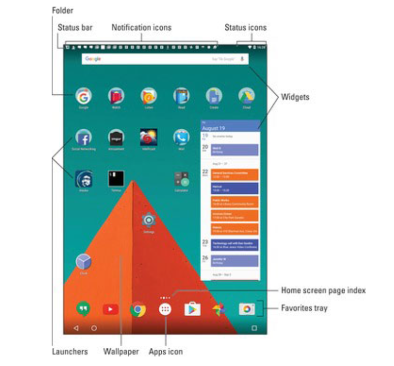 The main screen on an Android tablet is called the Home screen. You’ll find several Home screen pages, some marching off to the left and others marching to the right, for a total of anywhere up to seven Home screen pages, depending on the tablet. Each Home screen page can be adorned with icons and widgets.